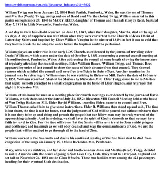 This document provides biographical information about William Twiggs, who was born in Wales in 1804, and his wife Mary Reed Twiggs, who was born in Wales in 1814. It details their marriage in 1840 and their ten children. William died in 1854 and Mary decided to emigrate with her surviving children and relatives to Utah to join the Mormon church. In late 1854, Mary and her family boarded the ship Clara Wheeler in Liverpool to travel to New Orleans, along with over 400 other Mormon emigrants. During the voyage and after arriving in New Orleans, 23 people on the ship died from an outbreak of measles. The family then traveled by steamboat to St. Louis and on to Mormon Grove near Atchison,