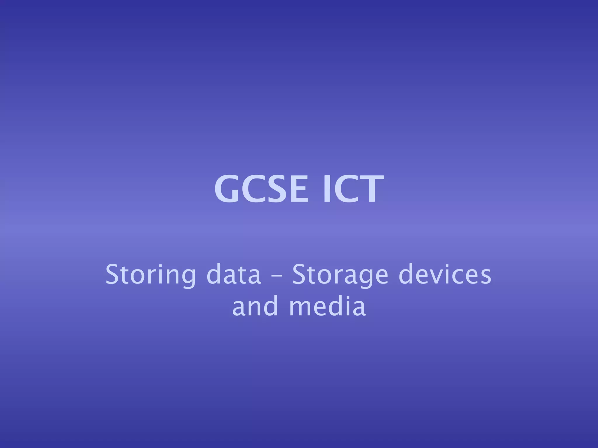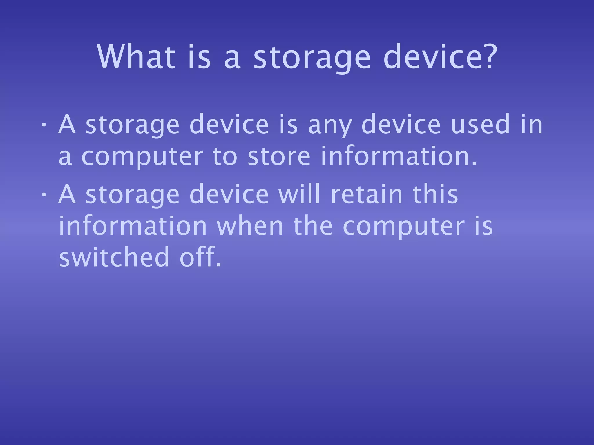 A storage device stores information on a computer and retains it when the computer is switched off. The most common internal storage device is a hard disk, which can store 60+ gigabytes of data on a circular, magnetized surface that spins rapidly. Externally, floppy disks and CDs are often used, with floppy disks holding up to 1.4 megabytes and CDs holding up to 650 megabytes of data. DVDs have largely replaced CDs due to being able to store much larger amounts of data, up to 17 gigabytes.