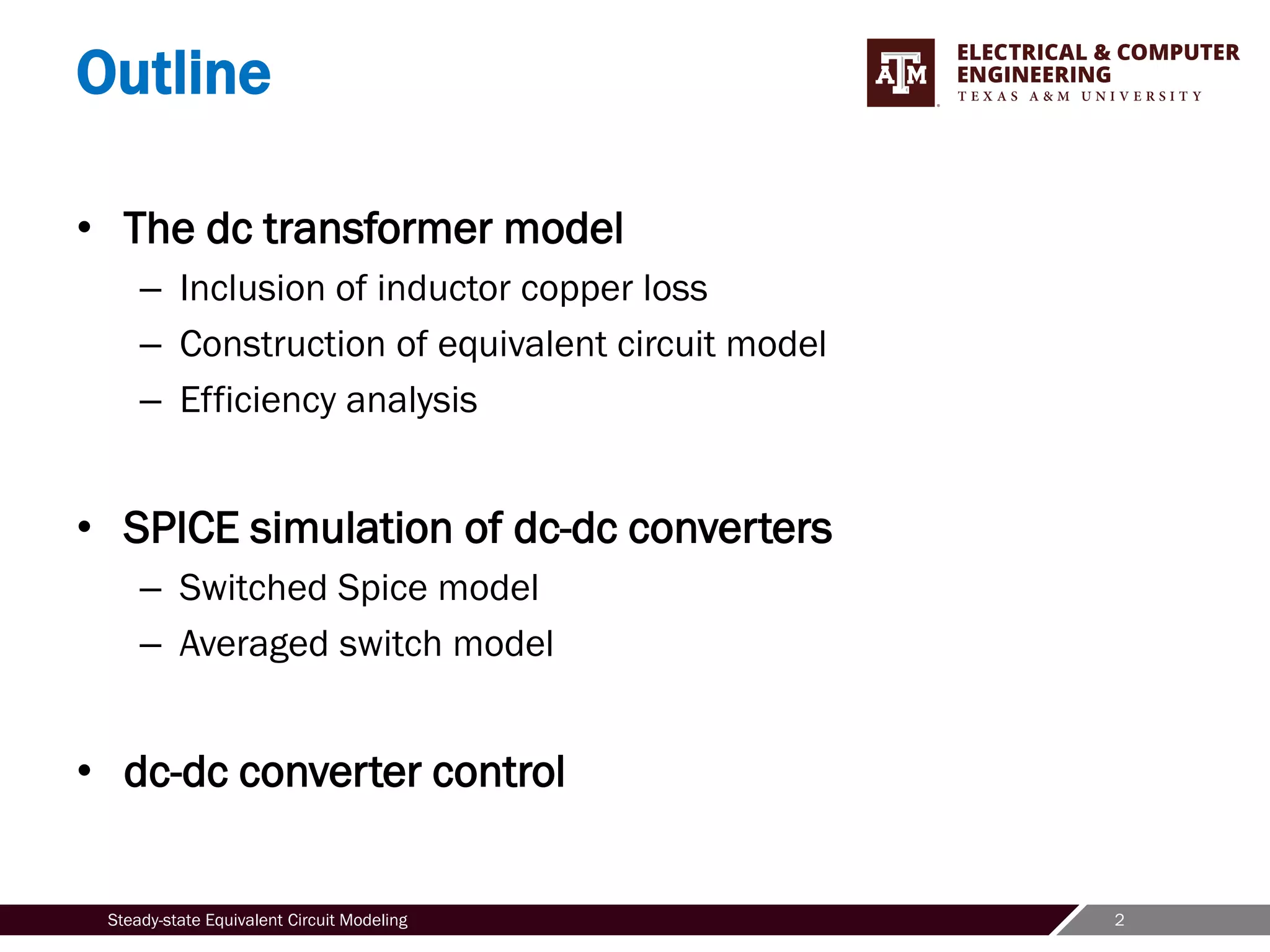 The document discusses steady-state equivalent circuit modeling of DC-DC converters. It covers topics such as the DC transformer model, inclusion of inductor copper loss, construction of equivalent circuit models, efficiency analysis, SPICE simulation techniques including switched and averaged models, and DC-DC converter control including feedback control. The document provides examples of applying these modeling techniques to non-ideal boost converters and synchronous buck converters.
