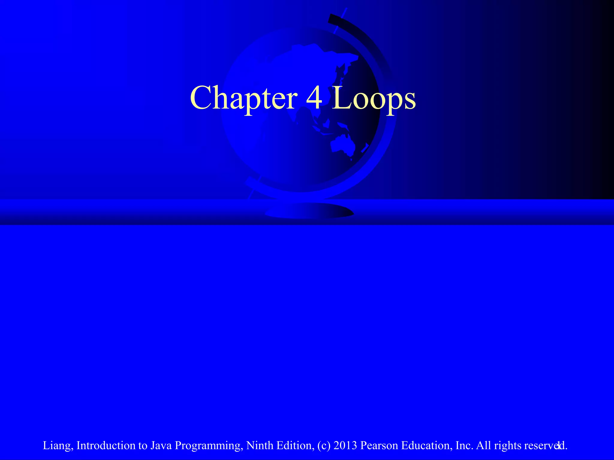 The document discusses using loops to repeatedly execute code in Java. It introduces the while loop as a way to print the string "Welcome to Java!" 100 times without writing the print statement 100 individual times. The while loop uses a counter variable that is incremented each pass through the loop to track how many times the loop has executed, and continues executing the code block while the counter is less than 100.