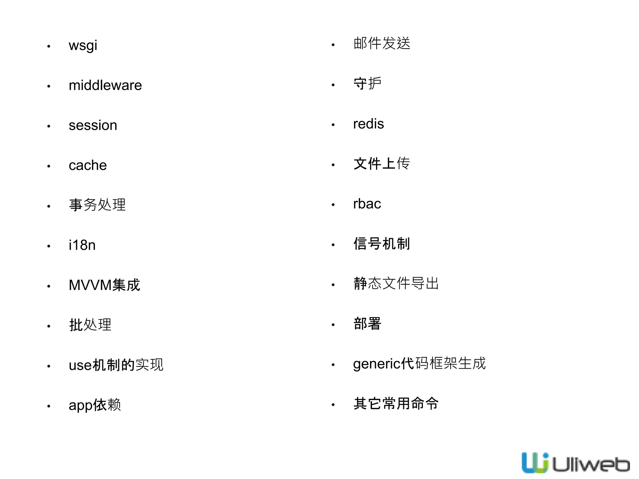 该文档介绍了Uliweb框架的各种功能,包括WSGI、middleware、session处理、事务管理、国际化、MVVM集成、缓存、邮件发送等。它提供了详细的配置方法和使用示例,旨在帮助开发者快速上手和有效利用Uliweb进行应用开发。文档还涵盖了部署和代码框架生成等常用命令。