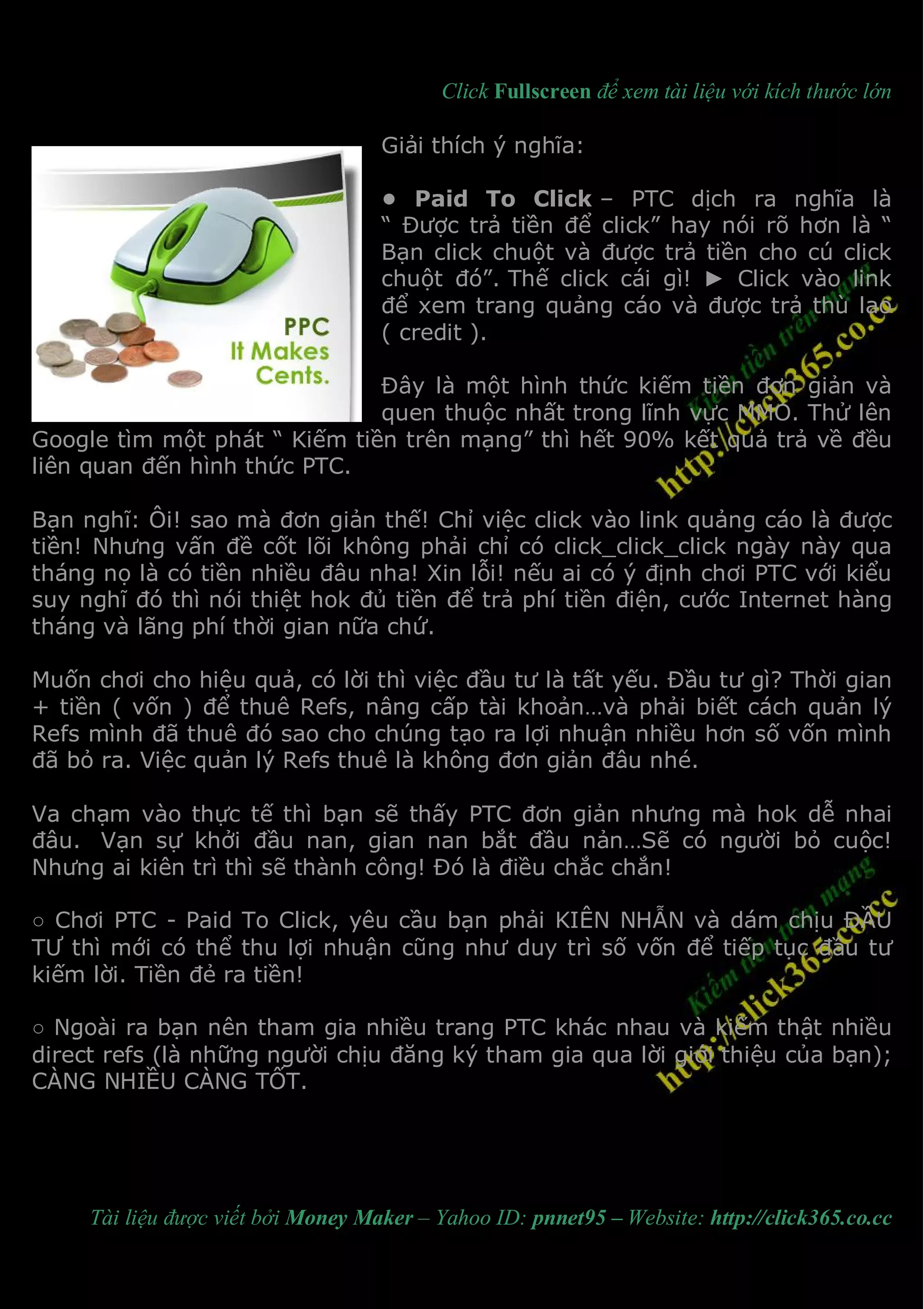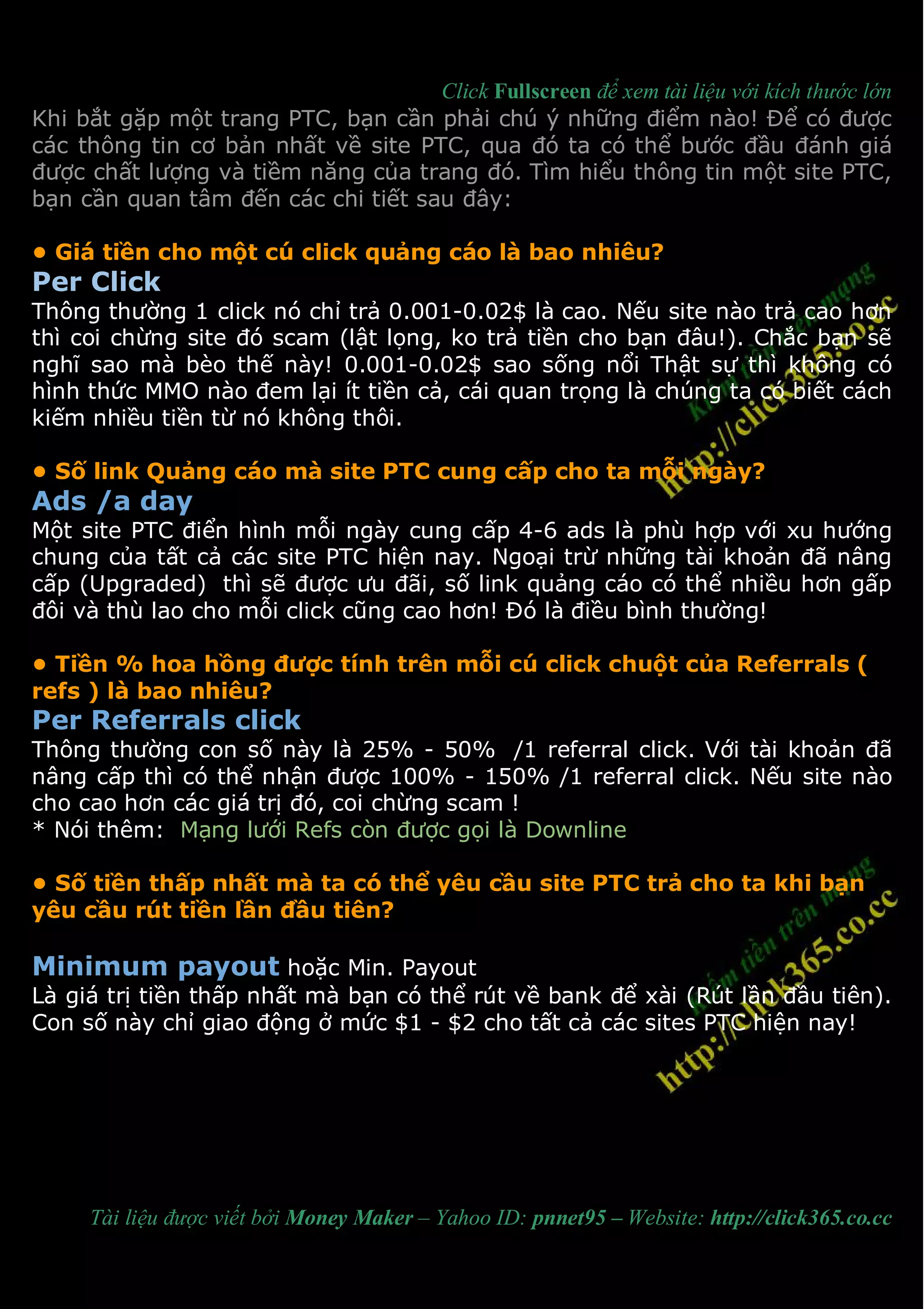 Tài liệu giải thích về hình thức kiếm tiền online gọi là paid to click (PTC), nơi người dùng kiếm tiền bằng cách click vào các quảng cáo. Để thành công, người chơi cần kiên nhẫn, đầu tư thời gian và tiền bạc vào việc quản lý referrals cũng như nâng cấp tài khoản. Tài liệu còn cung cấp những lưu ý quan trọng khi chọn trang PTC và các yếu tố cần xem xét để đánh giá chất lượng của chúng.