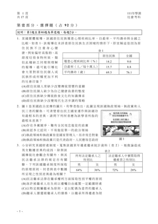 這是一份關於台灣學科能力測驗的社會考科考題文件,包含考試時間、作答注意事項及選擇題的計分規則。文件中有關於心理健康、自殺率及社會印象等議題的測試題目,旨在評量考生對社會現象的理解和分析能力。考題除了涉及數據統計,還包括對傳統文化、政治體制及歷史研究的探討。