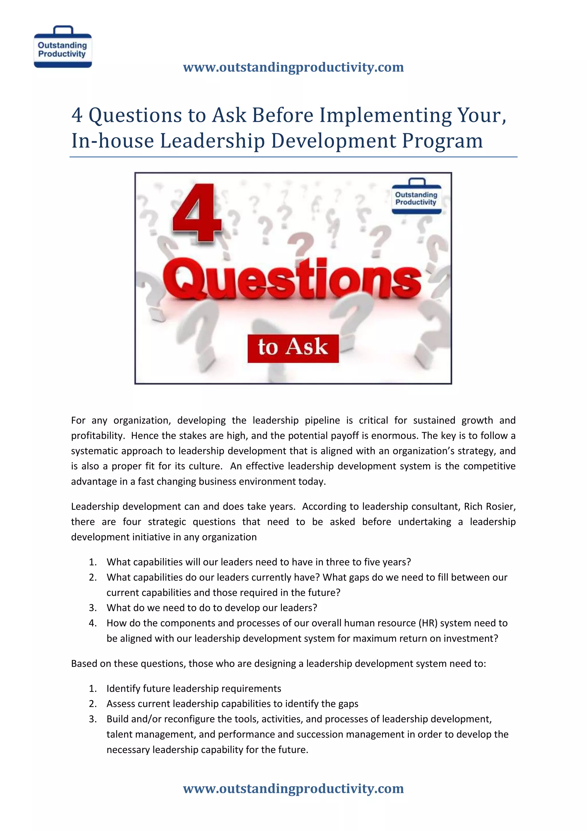 The document discusses leadership development programs and outlines four questions organizations should ask before implementing an in-house leadership program. It then provides details on how to design a leadership development system by identifying future leadership requirements, assessing current capabilities, and building tools and processes to develop necessary leadership capabilities. The document also describes leadership development services from Outstanding Productivity that include customized training programs, follow-up sessions, calls, and profiling to help clients develop their leadership pipeline and succession planning.