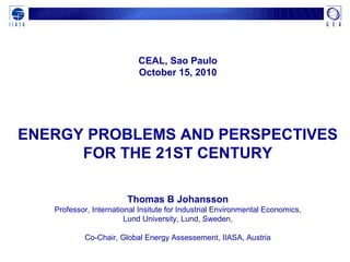 The document summarizes a presentation given by Thomas B Johansson on energy problems and perspectives for the 21st century. It discusses the major challenges requiring action on energy, including growing demand, access, affordability, security, and climate change mitigation. It outlines the Global Energy Assessment process involving knowledge modules and authors from around the world. Key points include that major energy system changes are needed, and that electricity, energy efficiency, and renewable energies can address all challenges simultaneously if deployed widely. The presentation concludes that transformative changes on energy are required, and that opportunities exist through policies, technologies, and global cooperation.