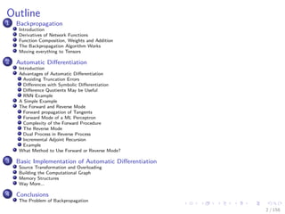 This document outlines and discusses backpropagation and automatic differentiation. It begins with an introduction to backpropagation, describing how it works in two phases: feed-forward to calculate outputs, and backpropagation to calculate gradients using the chain rule. It then discusses automatic differentiation, noting that it provides advantages over symbolic differentiation. The document explores the forward and reverse modes of automatic differentiation and examines their implementation and complexity. In summary, it covers the fundamental algorithms and methods for calculating gradients in neural networks.