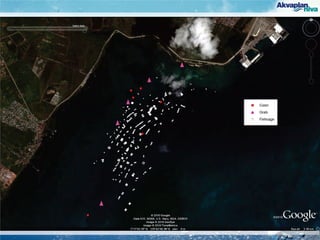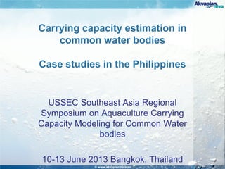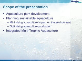This document discusses planning and management of aquaculture parks in the Philippines for sustainable development. It provides an overview of existing and planned mariculture park locations across the country. A case study of the Panabo Mariculture Park is used to demonstrate how carrying capacity modeling was used to optimize cage layout, include integrated multi-trophic aquaculture, and plan for expansion. Modeling of environmental impacts, nutrient budgets, and uptake by extractive species helped determine the optimal location of seaweed, oysters, and other benthic cultures within the park. Ensuring ecological, human, and governance well-being are key principles of the ecosystem approach used for sustainable aquaculture planning and management.