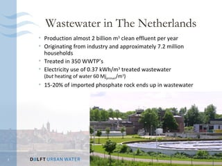 This document discusses trends and opportunities in wastewater treatment in the Netherlands over the next 60 years. It focuses on closing water, nutrient, and energy cycles by making wastewater treatment more sustainable. Key areas of focus include recovering nutrients and energy from wastewater, reducing energy usage, reusing water, and developing decentralized treatment methods. New treatment concepts like energy factories that integrate nutrient recovery and energy production are presented as ways to meet changing policy goals around water quality, energy reduction, and climate change.