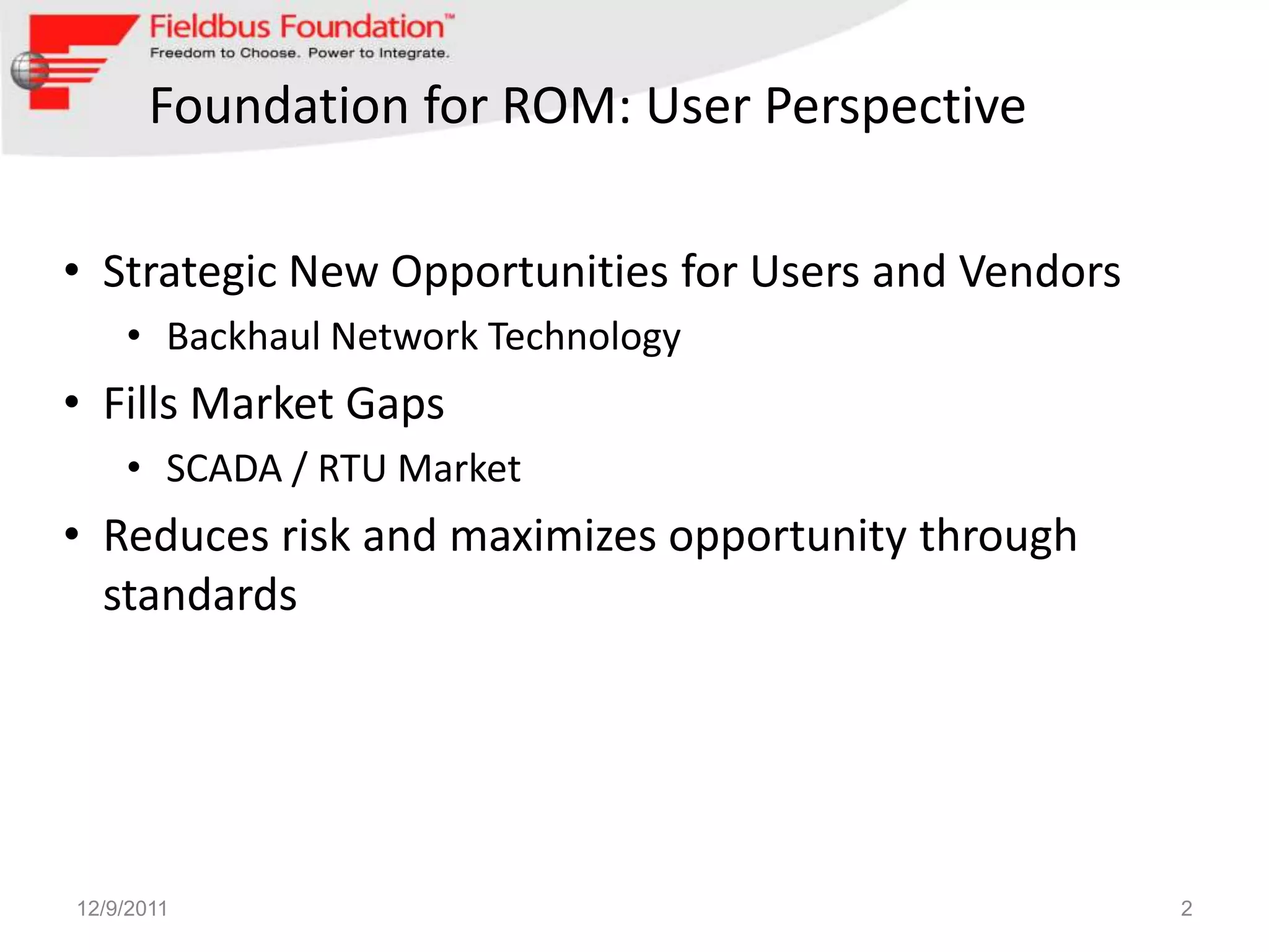 The document discusses a new backhaul network technology called ISA100.15 that provides strategic opportunities for users and vendors. It fills market gaps in the SCADA/RTU market by providing a multi-purpose, standardized technology supported by foundations and vendors. The technology can be used across many industries and provides infrastructure for remote operations management using ISA99 security models.