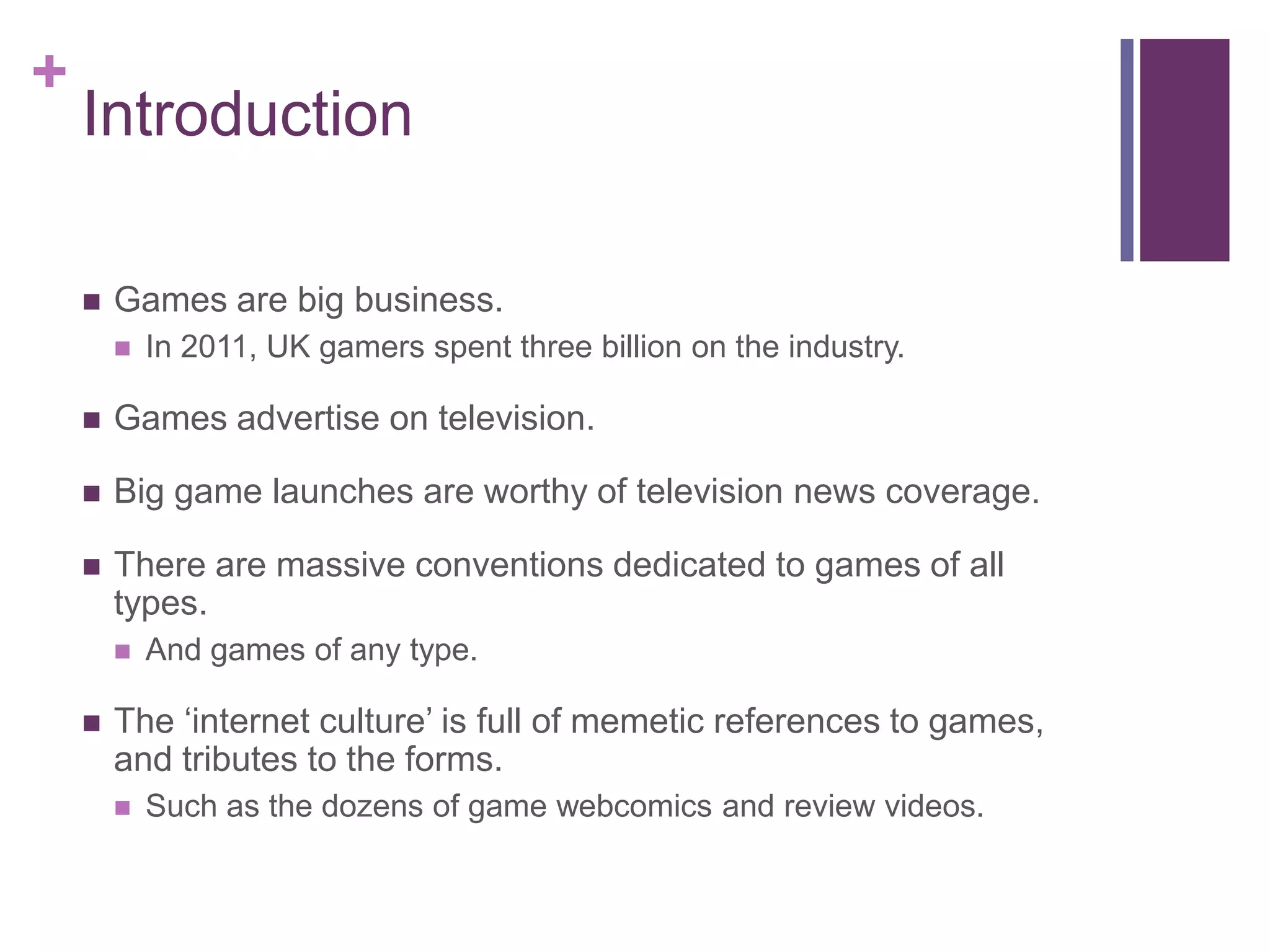 The document discusses the significance of video games in various domains, including education and political awareness, highlighting their role as effective learning tools and elicitors of engagement. It explores the evolution of 'serious games' that serve educational purposes and the psychological mechanisms behind the enjoyment and engagement they provide. The text also distinguishes between casual and hardcore games while examining their impact on brain chemistry and user experience.