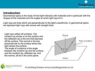 Geometrical optics is the study of how light interacts with materials and their shapes. Light rays reflect off surfaces according to the law of reflection, where the angle of incidence equals the angle of reflection. Refraction occurs when light travels from one medium to another and its speed changes, causing it to change direction. Snell's law describes the relationship between the refractive indices and angles of incidence and refraction between two media. Total internal reflection occurs when light travels from an optically dense to a less dense medium at an angle greater than the critical angle, and the light is fully reflected back into the first medium.