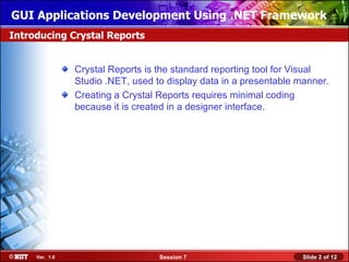 The document discusses Crystal Reports, a reporting tool used to display data in a presentable manner. Crystal Reports requires database drivers to connect to data sources and supports two data access methods: the pull model, which retrieves data directly from the data source, and the push model, where the developer retrieves data and caches it in a dataset. Crystal Reports can be created manually, with a wizard, or from an existing report, and its presentation quality enhanced with charts and cross-tab objects. It can be hosted in a Windows application using the CrystalReportViewer control bound to a report.