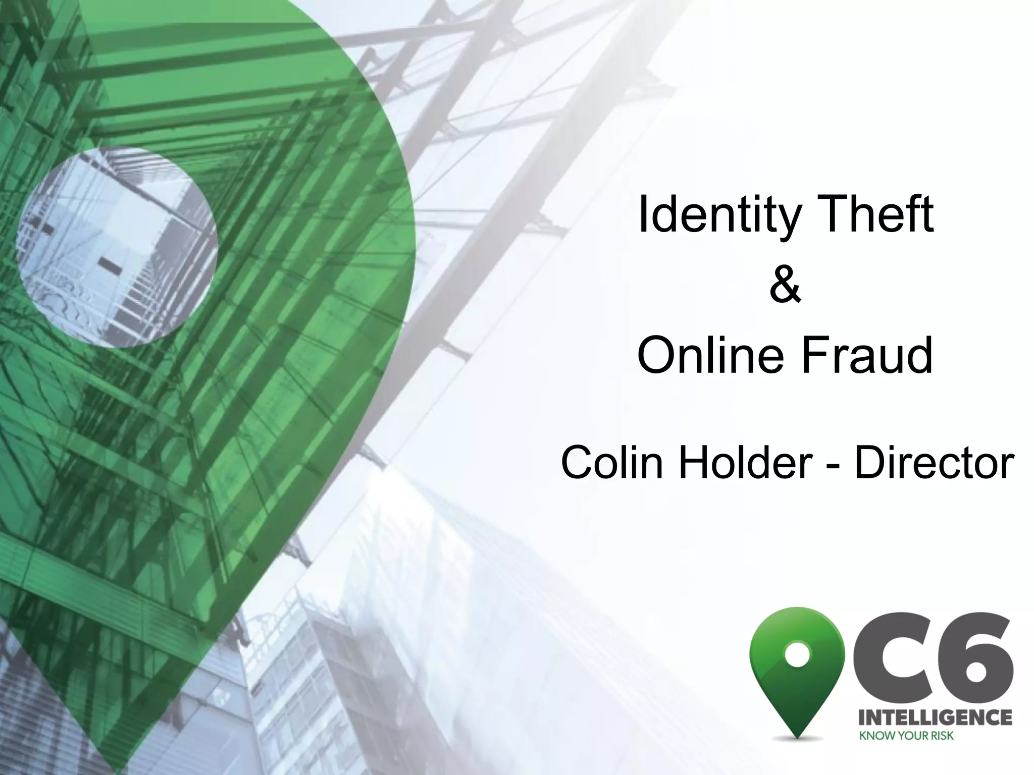 This document discusses identity theft and fraud. It provides information on the top banks affected by identity theft in the UK and lists many popular retailers and services that criminals use stolen credit cards and personal information to make fraudulent purchases from. It also outlines the types of private and government data that criminals can access to steal identities and describes the large identity theft database collected by the company C6 Intelligence, which gathers stolen identity records and scamming information to provide intelligence and risk assessment services to over 300 clients globally, including many banks and retailers.