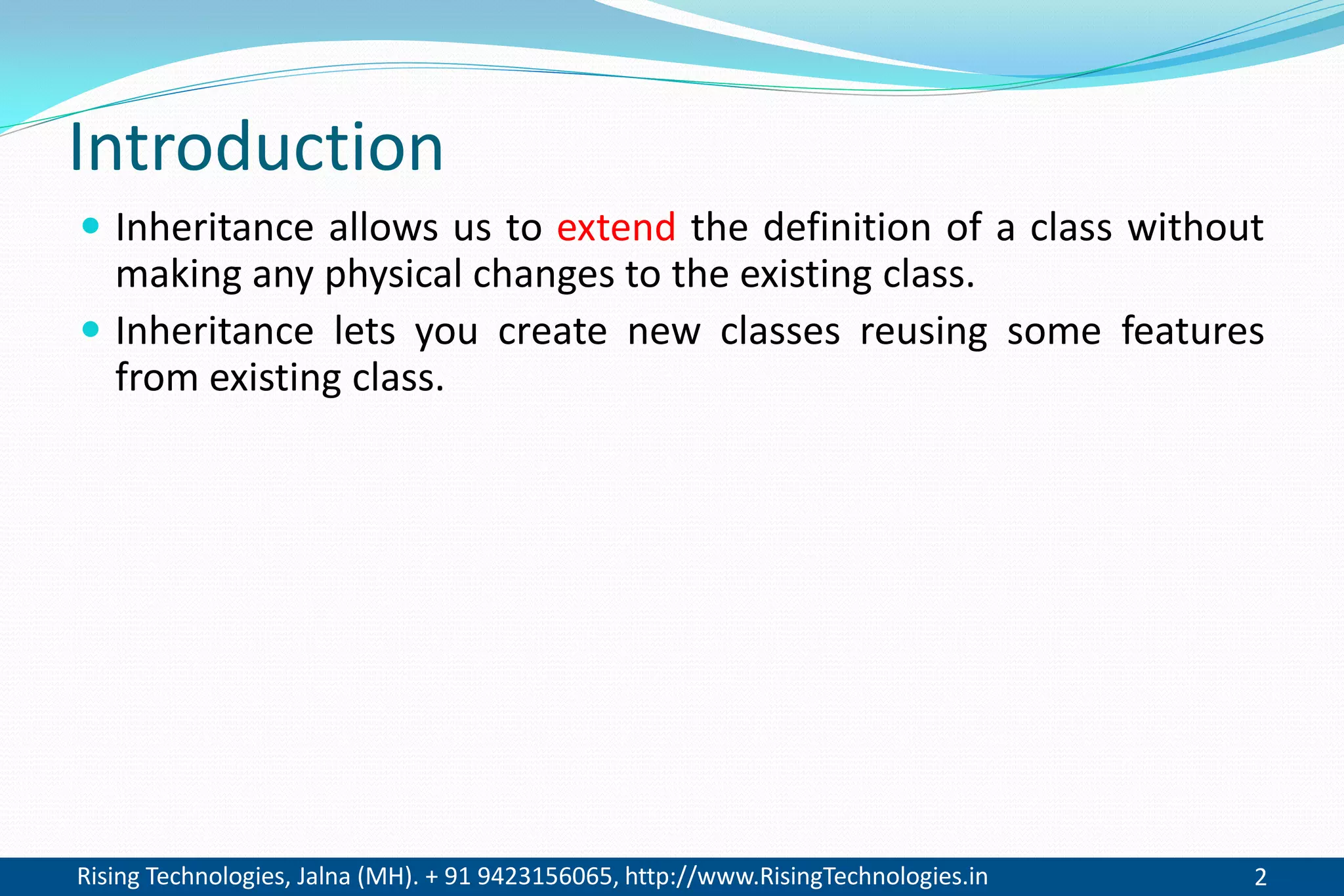 The document discusses inheritance in object-oriented programming. Inheritance allows a class to inherit features from a base class and extend them by adding its own features. There are different types of inheritance like single, multiple, multi-level and hierarchical inheritance. A derived class inherits members from the base class depending on whether the inheritance is public, private or protected.