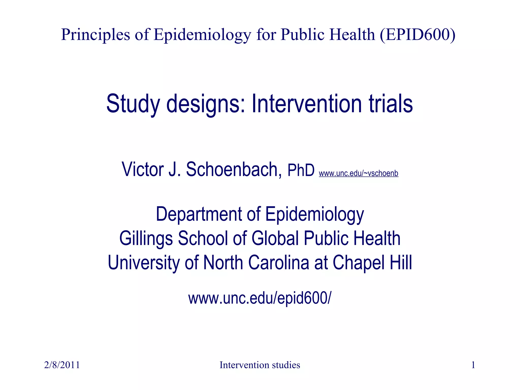 This document discusses intervention studies and randomized controlled trials. It begins by defining causality using the counterfactual model and comparing exposed and unexposed groups. It then describes the importance of randomization in intervention studies, noting that randomization helps ensure the unexposed group is a valid control, controls for unknown confounders, facilitates blinding, and provides a foundation for statistical tests. The document discusses types of intervention studies, issues like compliance, analysis approaches like intention-to-treat, and ethical considerations.