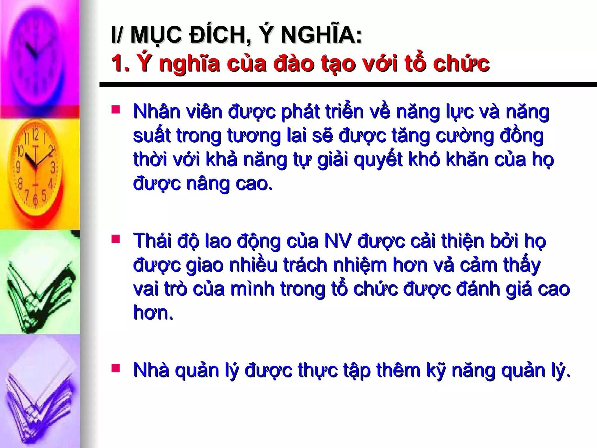 Tài liệu nêu rõ ý nghĩa của việc đào tạo nhân viên không chỉ nâng cao năng lực và năng suất lao động mà còn cải thiện tinh thần làm việc và quản lý hiệu quả hơn cho cả tổ chức. Nó trình bày quy trình quản lý đào tạo, từ việc xác định nhu cầu và nội dung đào tạo đến phương pháp thực hiện và đánh giá hiệu quả. Cuối cùng, nó nhấn mạnh tầm quan trọng của việc kèm cặp để hình thành kỹ năng và hỗ trợ nhân viên trong công việc.