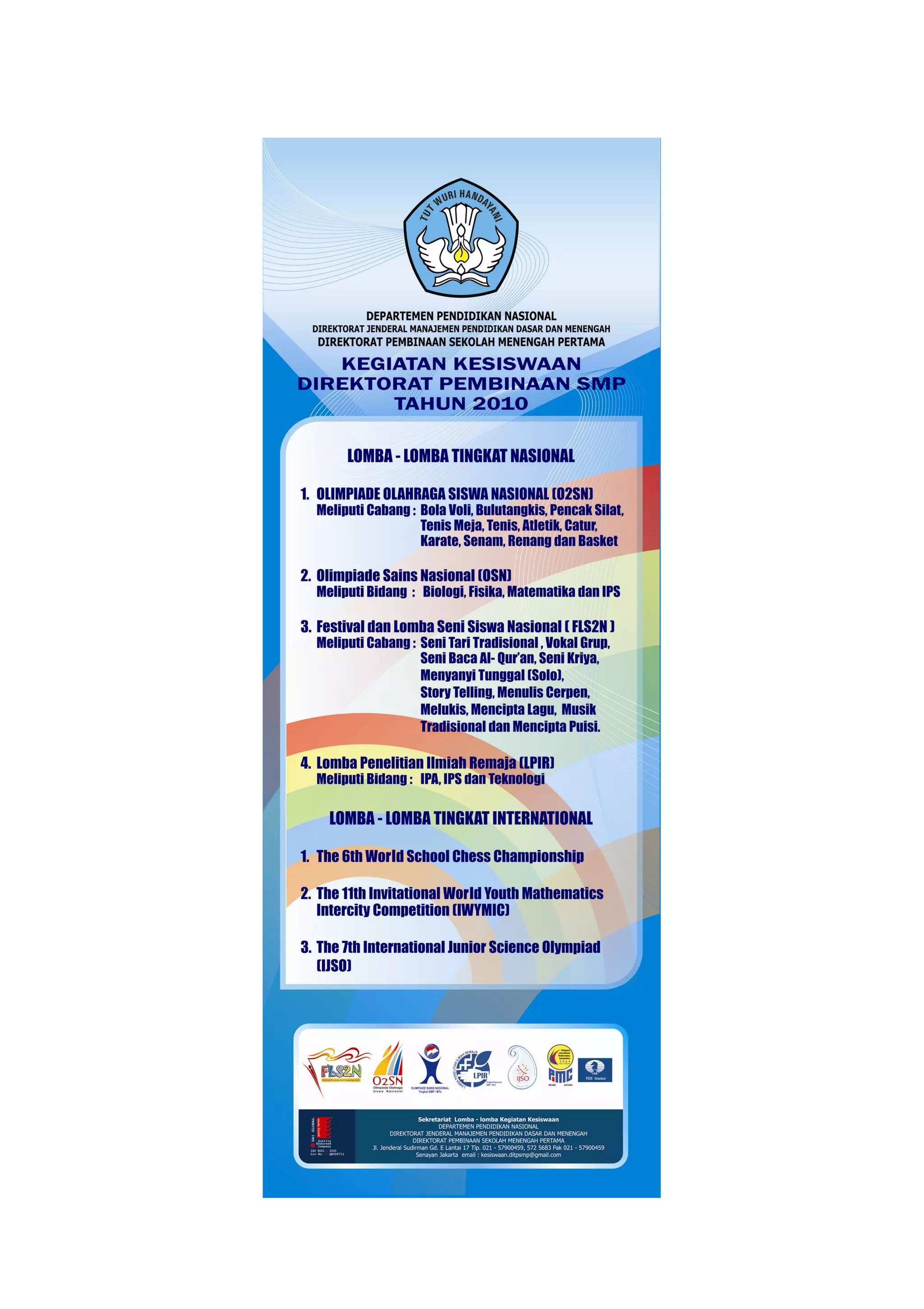 Dokumen ini menjelaskan pelaksanaan undang-undang dan kebijakan pendidikan di Indonesia, terutama dalam meningkatkan mutu pendidikan dasar, dengan fokus pada partisipasi siswa SMP yang telah mencapai 98,11% pada akhir 2009. Surat ini juga menekankan perlunya program lomba penelitian ilmiah remaja untuk mengembangkan kreativitas dan inovasi siswa dalam ilmu pengetahuan dan teknologi. Diharapkan bahwa kebijakan ini dapat meningkatkan kualitas pendidikan dan mempersiapkan siswa untuk bersaing di era globalisasi.
