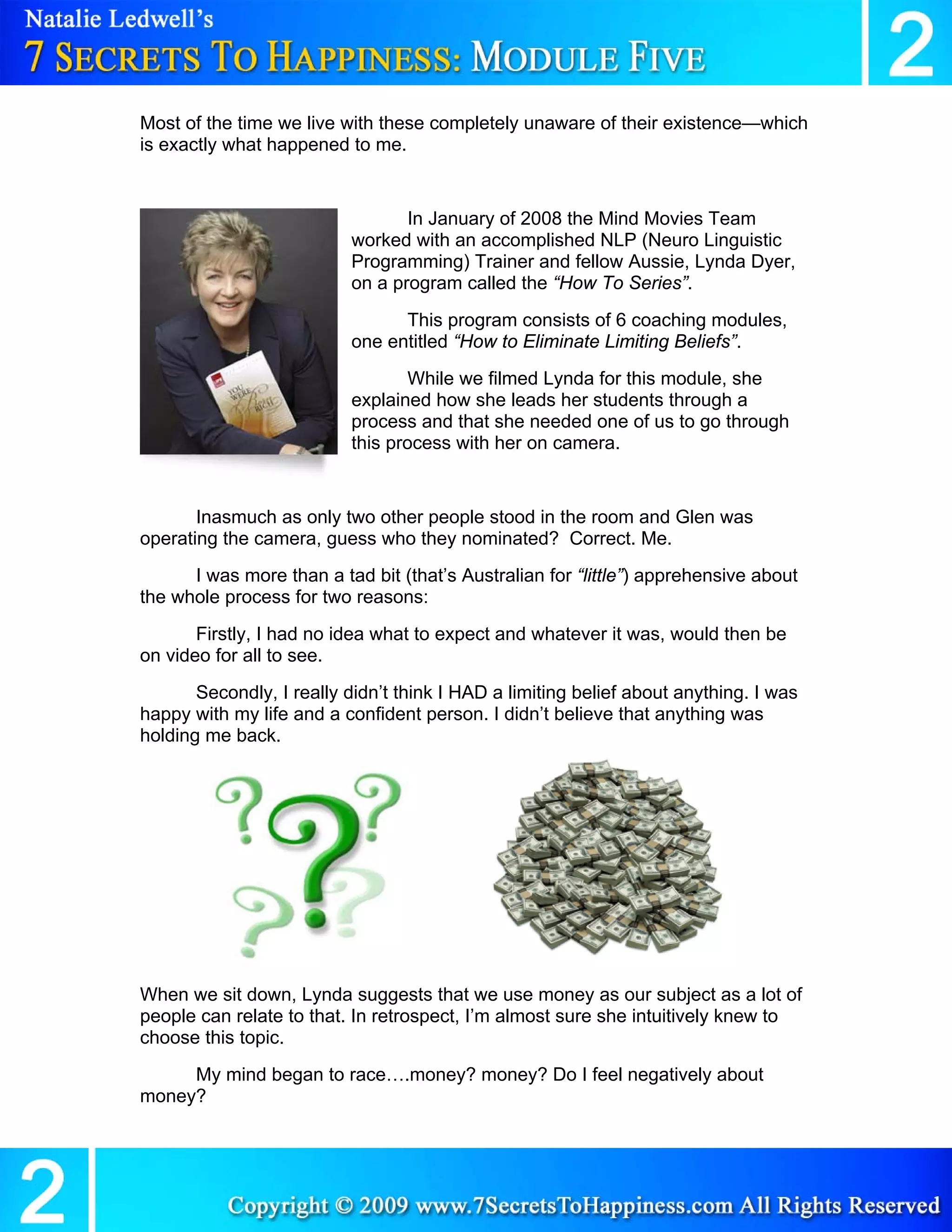 This document discusses limiting beliefs and how to eliminate them. It describes how limiting beliefs form in childhood from messages absorbed from caregivers and experiences. These beliefs reside unconsciously and influence behaviors and ability to achieve goals. The author shares experiencing a limiting belief around money after undergoing a process with an NLP trainer to uncover buried beliefs. Daily dream discussion with a partner about having already achieved goals can help replace limiting beliefs with empowering beliefs by vibrating at the frequency of the desired outcome. Burning a written description of a limiting belief and keeping a description of the desired situation can also help release limiting beliefs.