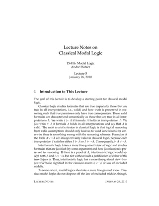 1) Classical modal logic studies formulas that are necessarily true and how necessity is preserved in reasoning. Formulas of the form φ ∨ ¬φ are always valid.