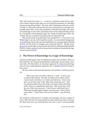 3) The document uses a puzzle about three wise men with colored hats to illustrate a logic of knowledge. It defines axioms and rules for reasoning about what individuals know, including generalization, K, T, and 4.