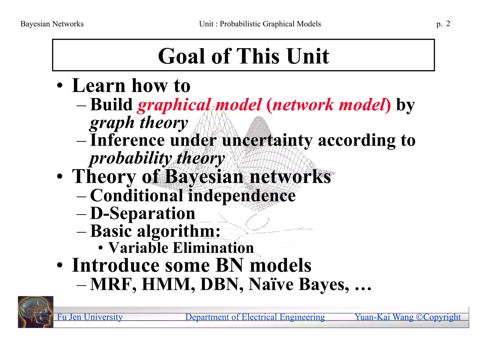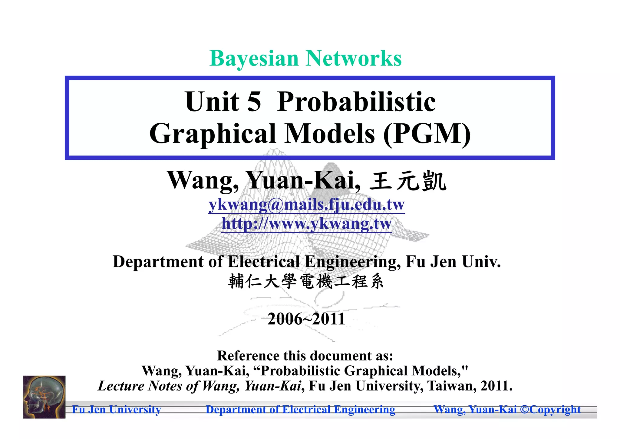 This document provides an overview of Bayesian networks and probabilistic graphical models (PGMs). It outlines the goals of learning how to build graphical models using graph theory and perform inference under uncertainty using probability theory. It also lists some example PGM models like Markov random fields, hidden Markov models, dynamic Bayesian networks, naive Bayes models, and applications in computer vision. Finally, it provides the table of contents and references for further self-study on PGMs and Bayesian networks.