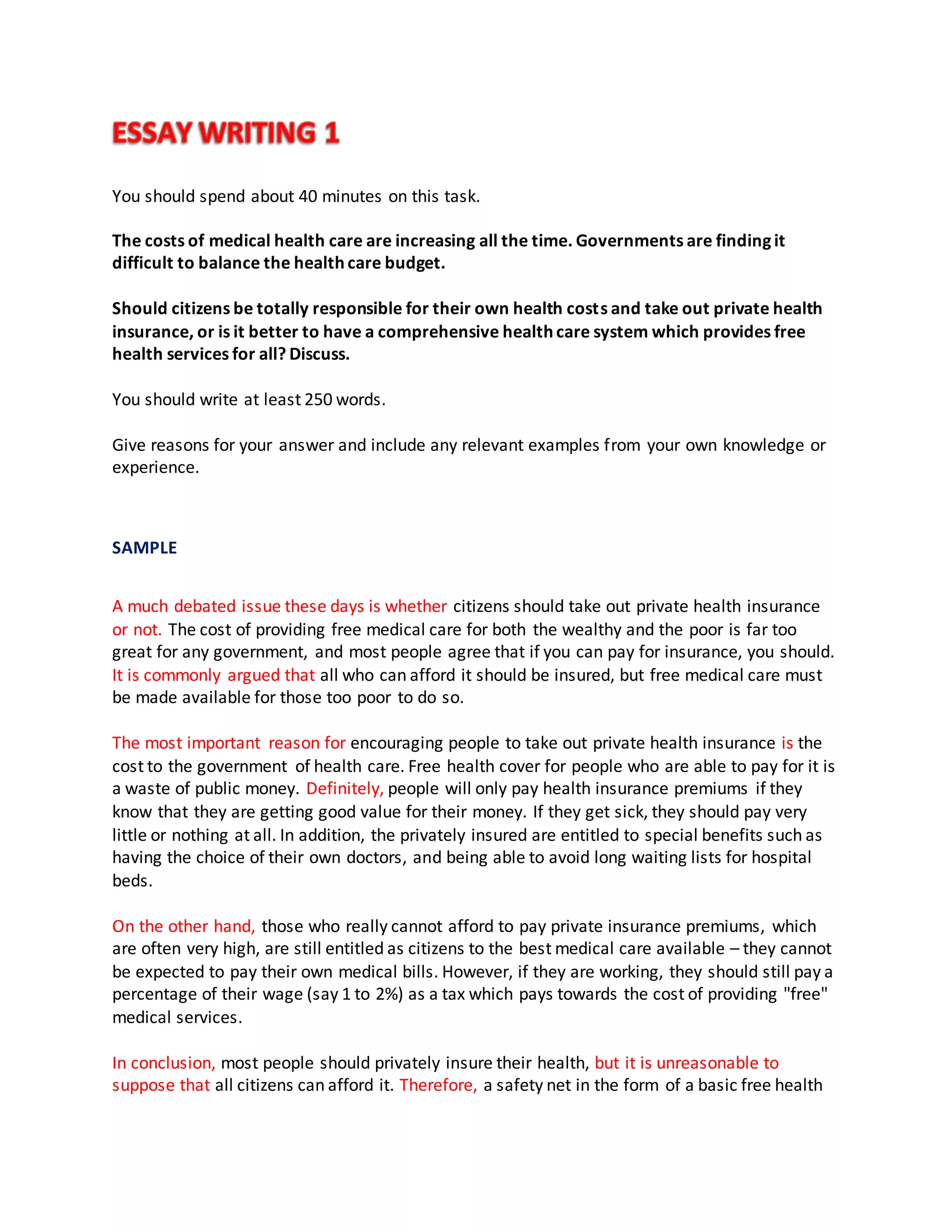 The document discusses whether citizens should be responsible for their own health costs through private insurance or if a universal public healthcare system is preferable. It provides arguments for both approaches. It concludes that most people should have private insurance if affordable, but a public system is still needed to provide basic coverage for the poor and unemployed.