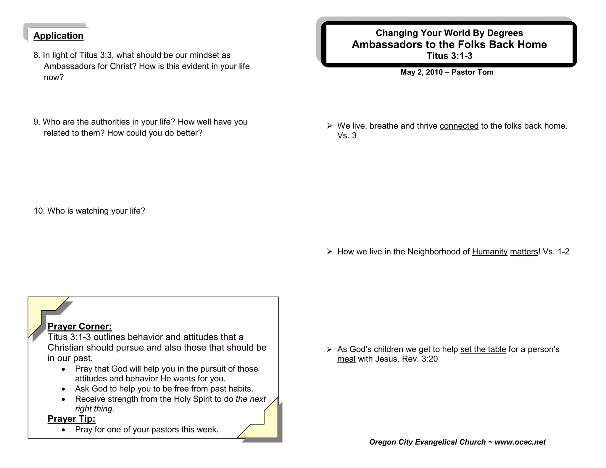 Paul instructed Titus that Christians should be subject to rulers and authorities, to be obedient and ready for every good work. They should avoid slander and instead be gentle and show humility toward all people. This is because in the past, all people were foolish, disobedient, deceived, and enslaved to various passions. But God saved Christians through the washing of rebirth and renewal by the Holy Spirit.