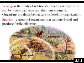 This document discusses key concepts in ecology including communities, ecosystems, and trophic levels. It defines species, populations, communities, ecosystems, habitats, biotic and abiotic factors. It describes producers (autotrophs) that use photosynthesis and consumers (heterotrophs) that obtain energy from other organisms. Food chains and webs are explained as well as trophic levels. Energy flow and nutrient recycling in ecosystems is also summarized.