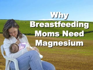 Magnesium is an important nutrient absorbed from breast milk that is necessary for many bodily functions. It plays a role in muscle relaxation, energy production, blood sugar regulation, and building strong bones and teeth. However, most Americans do not get enough magnesium in their diets. This is especially important for breastfeeding mothers, as they need 20% more magnesium daily than average. Without sufficient magnesium supplementation, breastfeeding mothers consuming under 2,200 calories daily are unlikely to meet their magnesium needs. Supplementing with 600mg of magnesium such as magnesium chloride can help support breastfeeding mothers' magnesium levels.