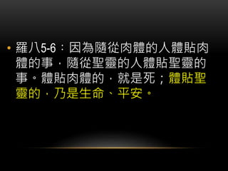 • 羅八5-6︰因為隨從肉體的人體貼肉 體的事,隨從聖靈的人體貼聖靈的 事。體貼肉體的,就是死;體貼聖 靈的,乃是生命、平安。