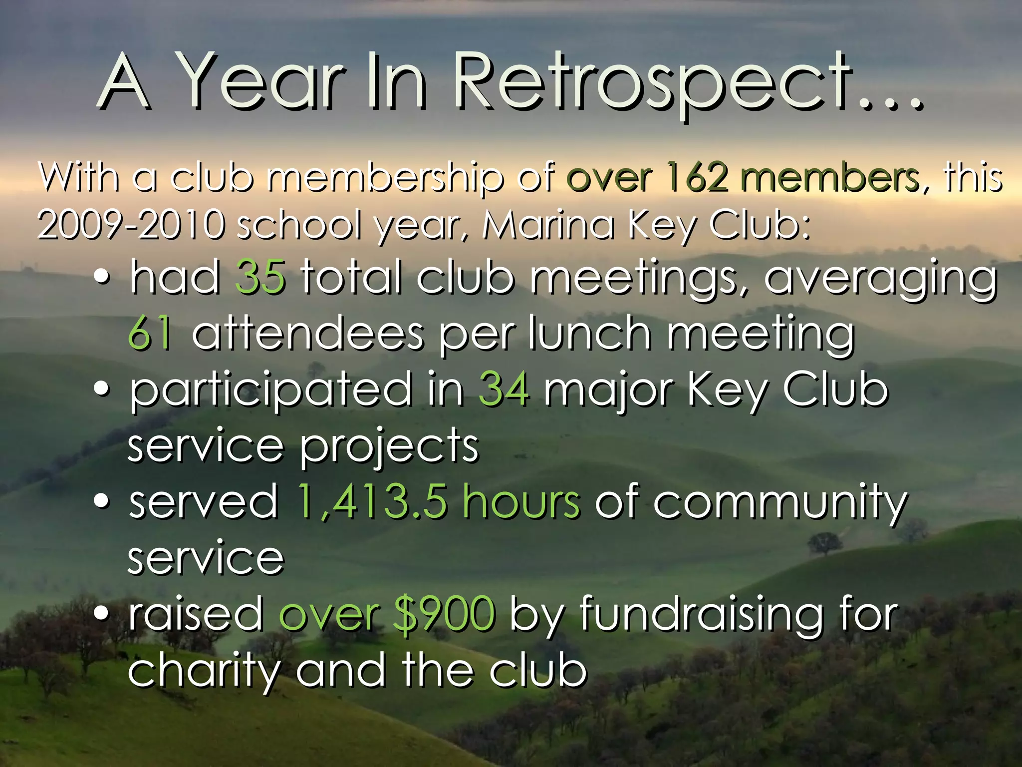 This document summarizes the activities of the Marina Key Club for the 2009-2010 school year. It notes that the club had over 162 members, 35 meetings averaging 61 attendees, participated in 34 service projects, served 1413.5 hours of community service, and raised over $900 for charity. Upcoming events for the club are also announced, including pop tab collection, tutoring, gardening, participating in the Fountain Valley Relay for Life, helping with the Fountain Valley Summerfest, attending the Division 4 West Banquet, and a beach cleanup.