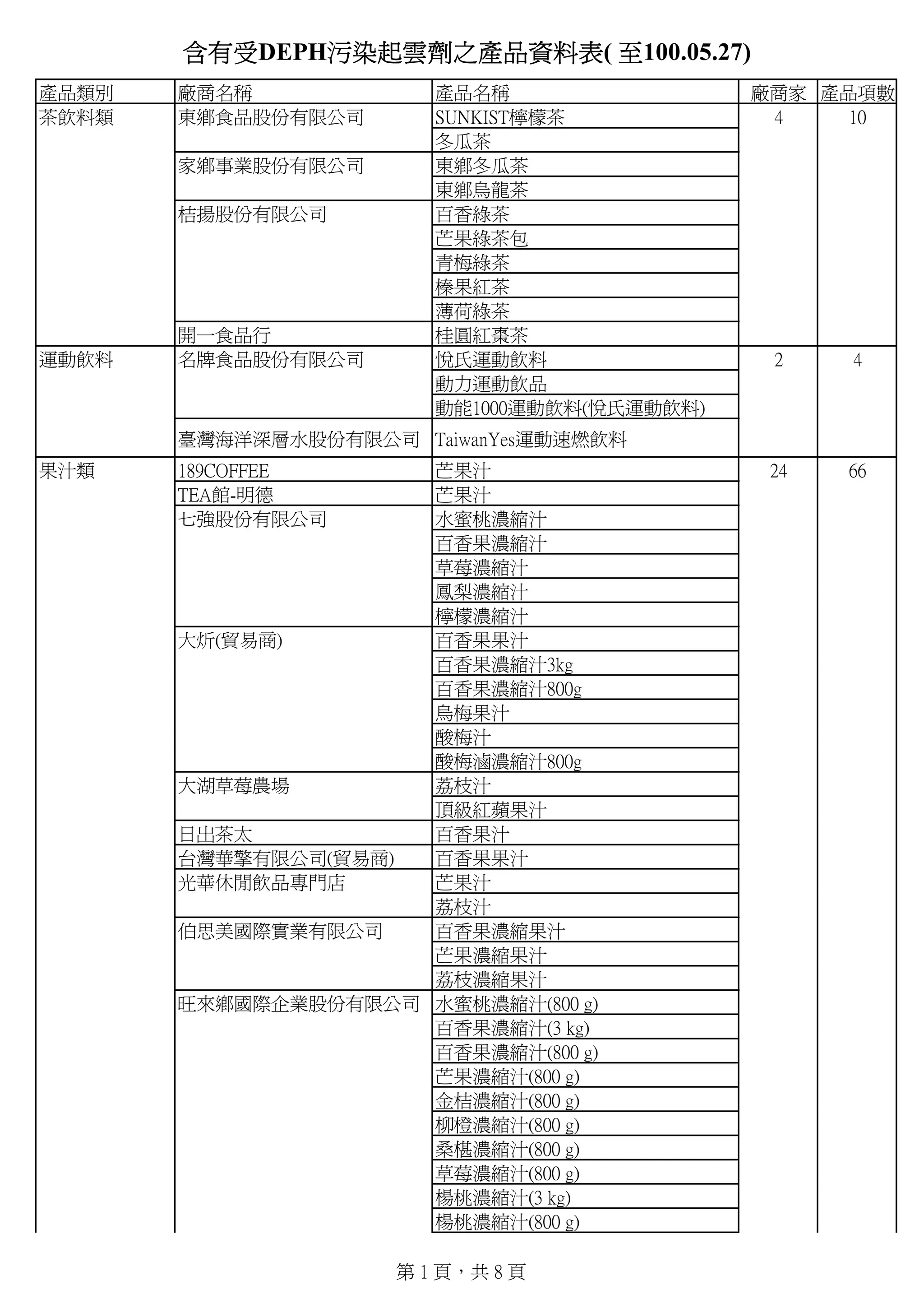 此文档提供了一份包含各种饮料、果汁、果浆和保健产品的清单,详细列出每种产品的类别、厂家和产品名称。文档中的产品包括茶饮、运动饮料、果汁、果酱及维生素等,旨在展示市场上可用的饮品和食品材料。整体信息详尽,适用于行业分析和产品开发参考。