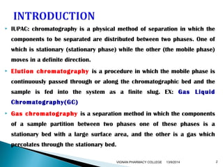The document discusses gas chromatography (GC) and mass spectrometry (MS) as analytical techniques used for the separation and identification of chemical compounds. It explains the principles of GC, including the roles of mobile and stationary phases, and highlights the process of mass spectrometry in determining molecular weights and structures through ionization methods. Additionally, it covers the coupling of GC with MS for advanced analysis and various applications in fields like pharmaceuticals, environmental monitoring, and toxicology.