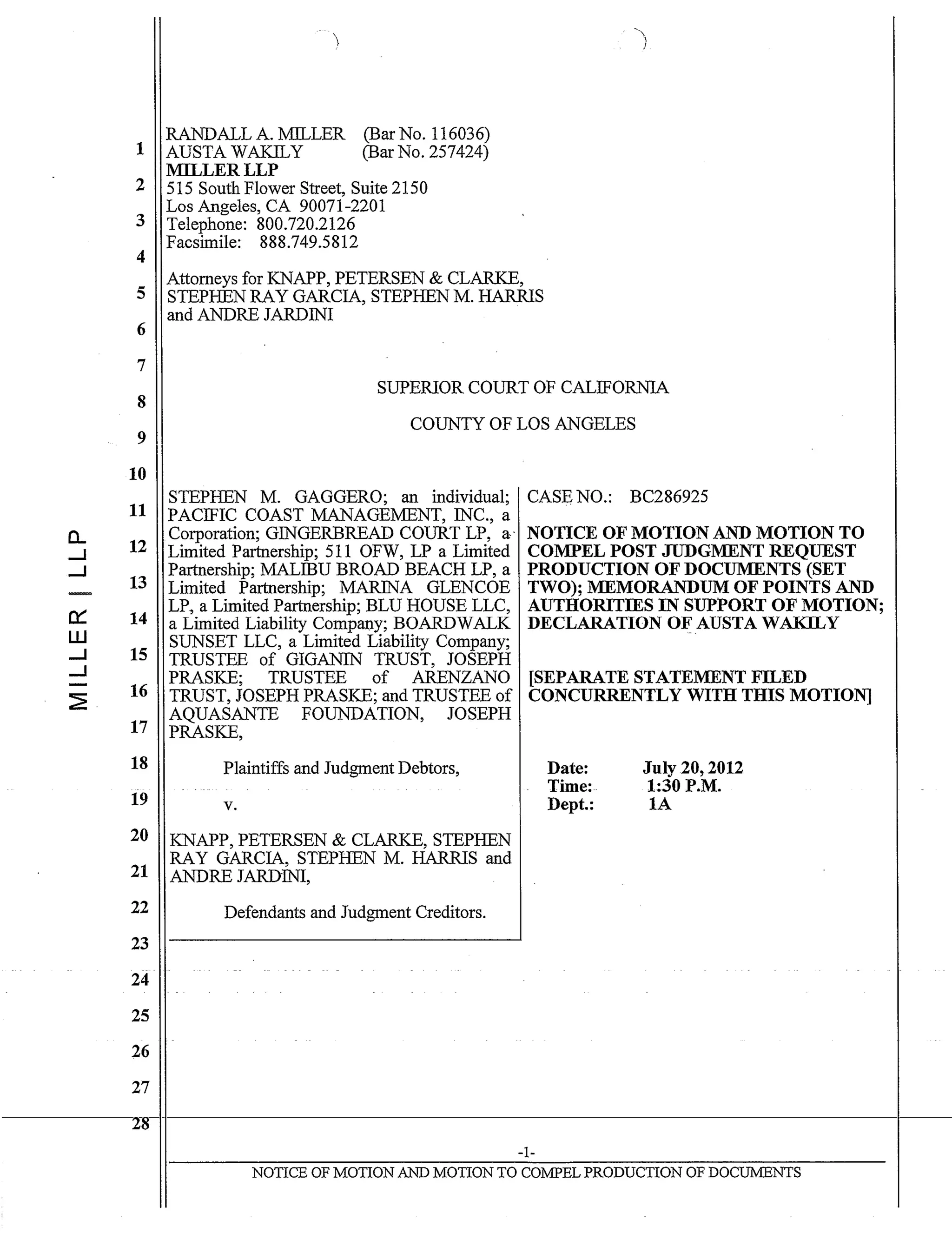 This motion seeks to compel judgment debtor Stephen Gaggero to produce documents in response to a request for production from the judgment creditors Knapp, Petersen & Clarke, Stephen Ray Garcia, Stephen Harris, and Andre Jardini (KPC) related to enforcing their judgment. KPC argues that Gaggero's responses improperly withheld relevant documents and asserted invalid claims of privilege. KPC requests the court order production of the requested documents, award $10,840 in attorney fees for bringing this motion, and sanction Gaggero's attorney $5,000 for obstructing discovery.