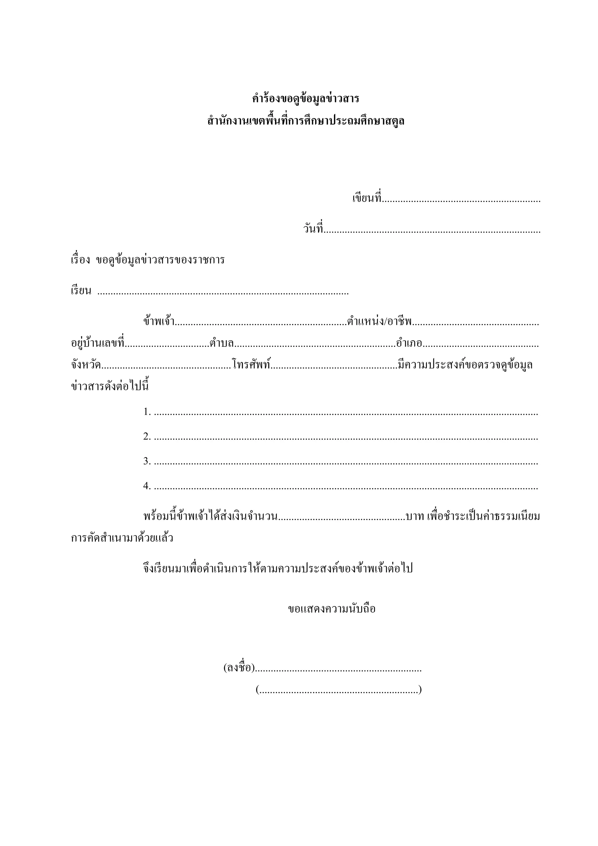 ่ เขียนที่............................................................ วันที่.................................................................................. เรื่ อง ขอดูขอมูลข่าวสารของราชการ ้ เรี ยน ............................................................................................... ข้าพเจ้า.................................................................ตาแหน่ง/อาชีพ................................................ ่ ้ อยูบานเลขที่................................ตาบล.............................................................อาเภอ............................................ จังหวัด.................................................โทรศัพท์................................................มีความประสงค์ขอตรวจดูขอมูล ้ ข่าวสารดังต่อไปนี้ 1. ................................................................................................................................................. 2. ................................................................................................................................................. 3. ................................................................................................................................................. 4. ................................................................................................................................................. พร้อมนี้ขาพเจ้าได้ส่งเงินจานวน................................................บาท เพื่อชาระเป็ นค่าธรรมเนียม ้ การคัดสาเนามาด้วยแล้ว จึงเรี ยนมาเพื่อดาเนินการให้ตามความประสงค์ของข้าพเจ้าต่อไป ขอแสดงความนับถือ (ลงชื่อ)............................................................... (............................................................)