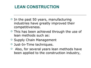 Lean construction is a process used in the construction industry to maximize value and minimize waste based on lean manufacturing principles. It utilizes techniques like supply chain management and just-in-time to improve information sharing and reduce waste. The Toyota Production System pioneered lean thinking by identifying and eliminating sources of waste to improve productivity, quality, and workforce satisfaction. Applying similar principles, lean construction aims to streamline project design and execution through prefabrication, continuous improvement, and collaboration across the project team.
