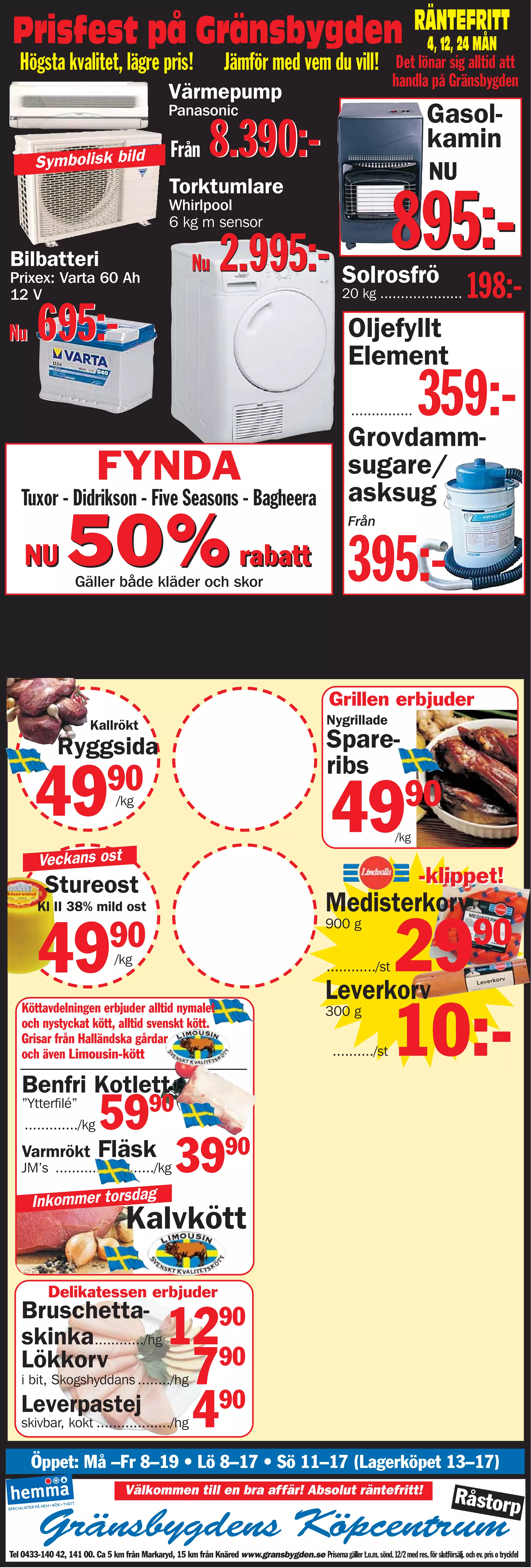 Tel 0433-140 42, 141 00. Ca 5 km från Markaryd, 15 km från Knäred www.gransbygden.se Priserna gäller t.o.m. sönd. 12/2 med res. för slutförsälj. och ev. pris o tryckfel