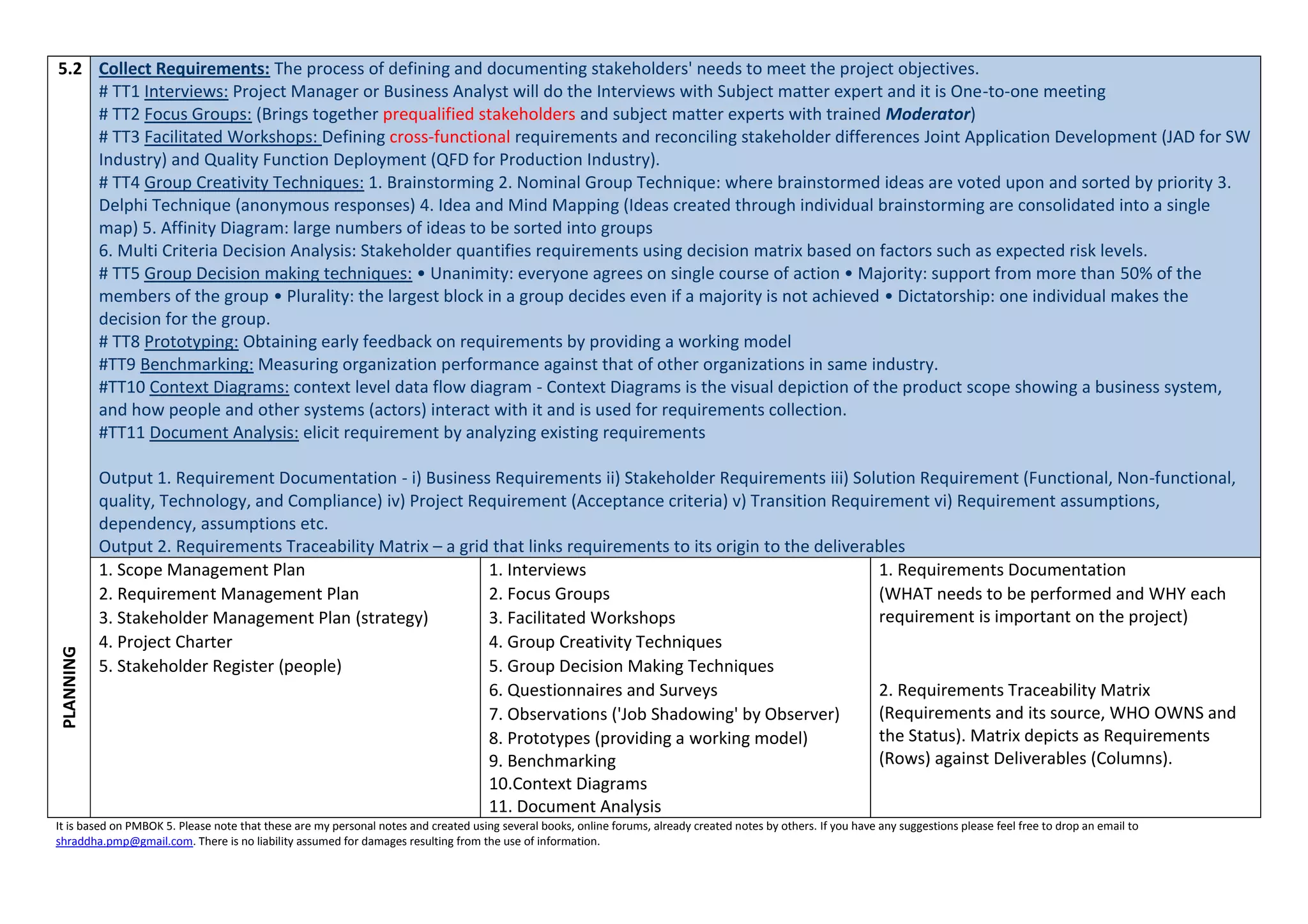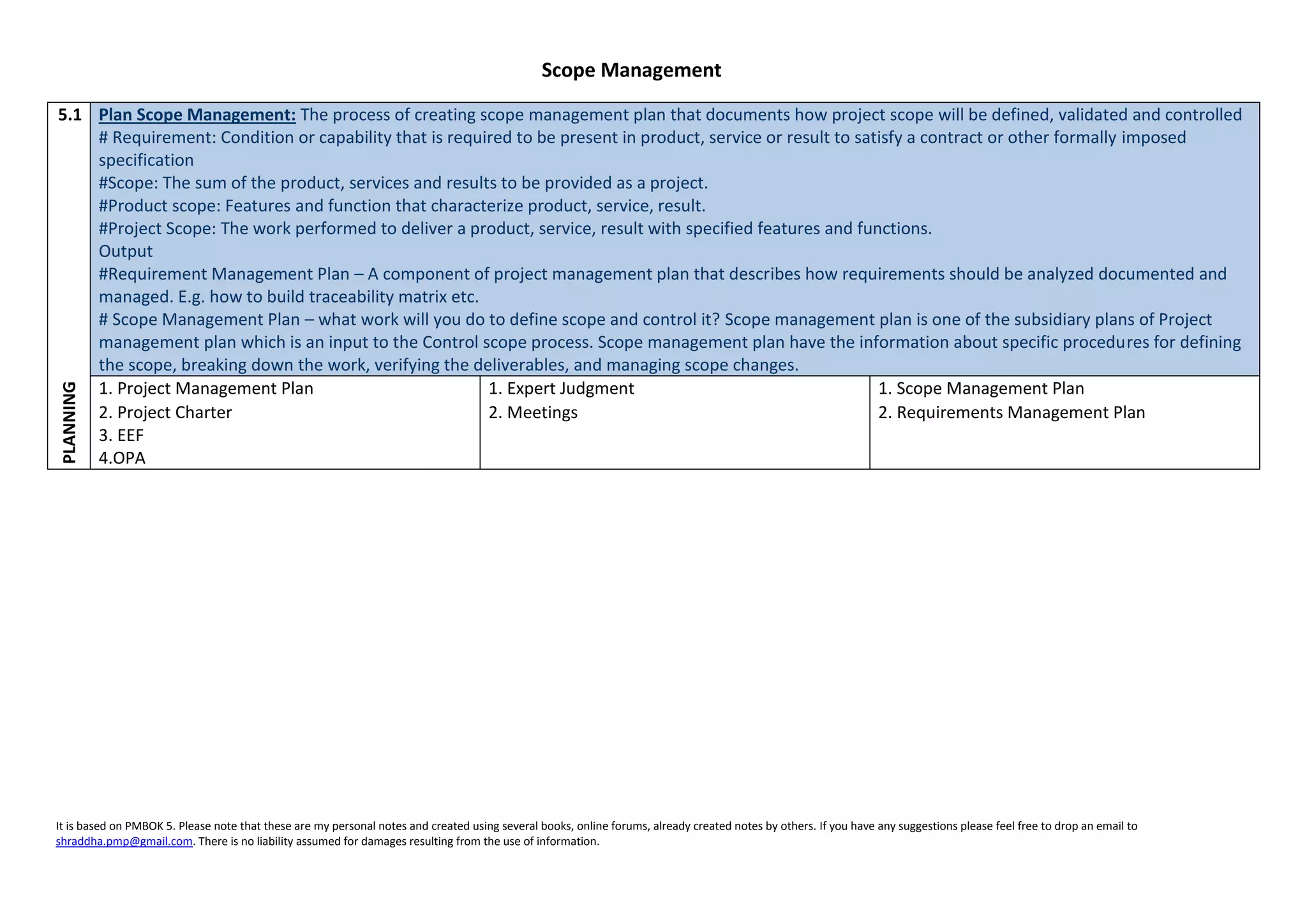 The document provides information on scope management processes based on the PMBOK 5th edition. It defines key terms related to scope such as requirements, product scope, and project scope. It then describes the six scope management processes - plan scope management, collect requirements, define scope, create WBS, validate scope, and control scope. For each process, it lists the inputs, tools and techniques, and outputs as defined in PMBOK. The document is intended as personal notes for scope management and requests feedback be provided to the specified email.