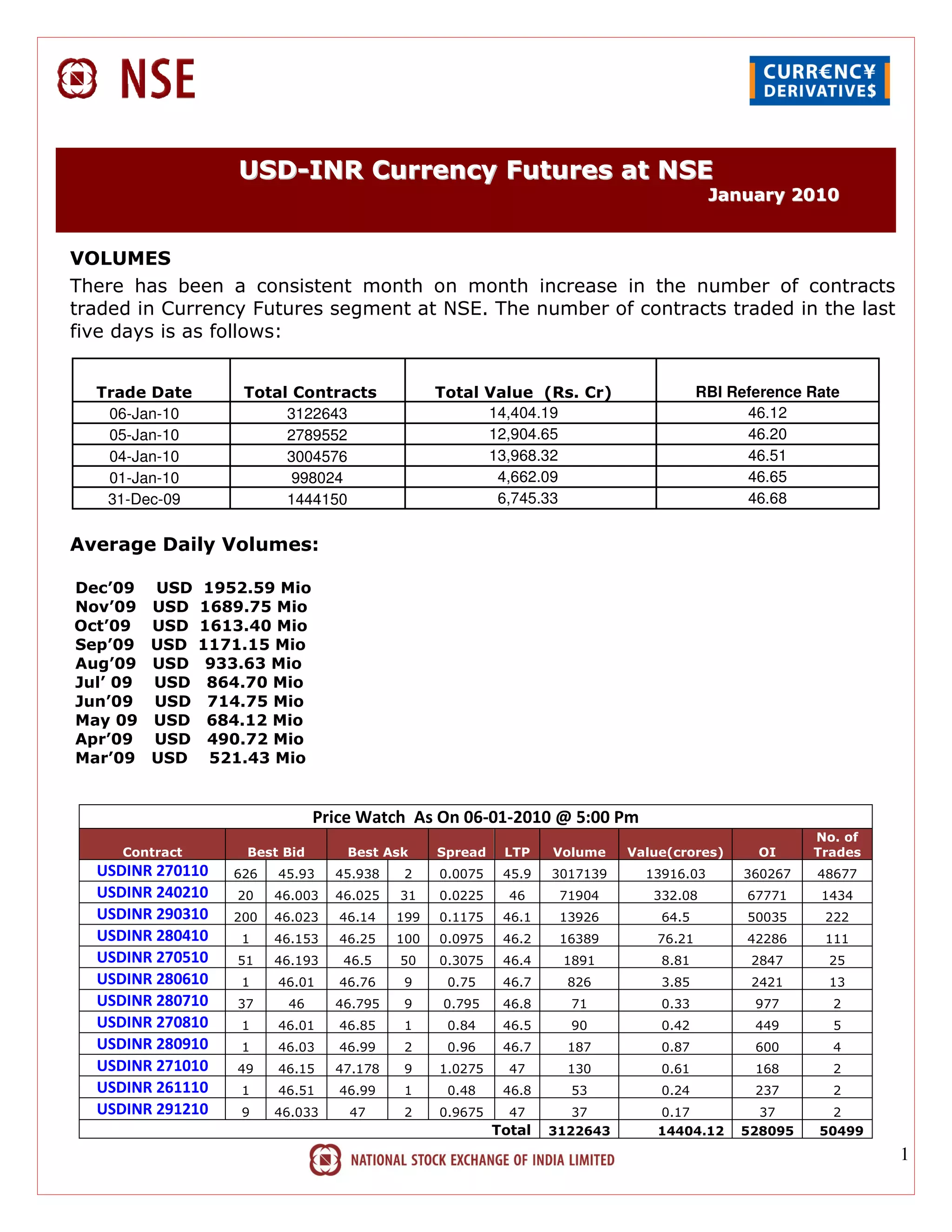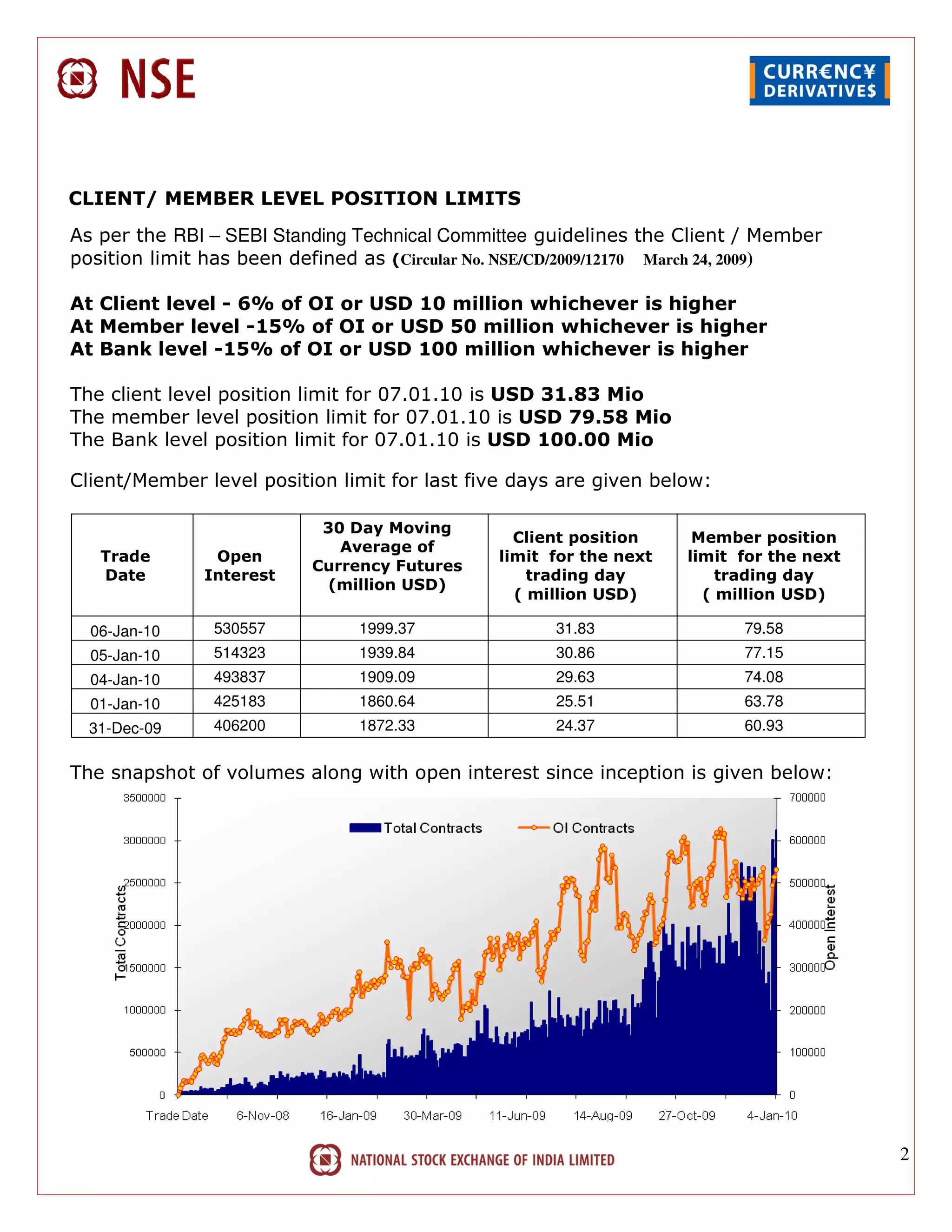 The document provides information on currency futures trading volumes and limits at the National Stock Exchange of India (NSE) for January 2010. Trading volumes for USD-INR futures contracts at the NSE have been increasing month over month. Position limits for clients, members, and banks are also outlined, with the client level position limit for January 7, 2010 given as USD 31.83 million. Tables show daily trading volumes and open interest over the last month as well as volatility metrics for the underlying USD-INR currency pair and stock index futures.