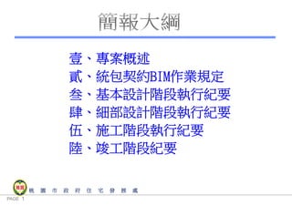 本报告由桃园市政府住宅发展处提供,介绍了桃园市中路二号基地新建公营住宅的项目进展,包括建筑信息模型(BIM)的作业规定和设计阶段的执行纪要。工程总金额为11.83亿新台币,建筑包含多栋楼及地下结构,涉及设计、施工及竣工等多个阶段的详细计划和绿色能效分析。该项目强调设计优化和节能策略,以满足现代住宅的需求与环境标准。