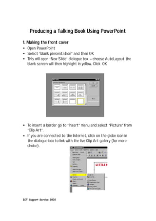 This document provides instructions for producing a talking book using Microsoft PowerPoint. It describes how to add slides with borders, insert text boxes to add titles and body text, include action buttons to navigate between slides, record narration and sync it to play with slide transitions, and save the completed talking book. The process involves opening PowerPoint, adding slides, formatting text, inserting graphics, recording audio, and setting slide transition and animation timing.