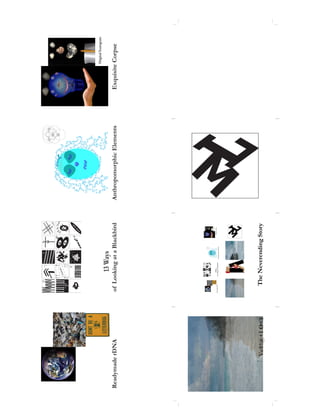 This document appears to be a list of 13 different artistic or creative works including "Readymade rDNA", "Original Scanogram", "13 Ways of Looking at a Blackbird", "Anthropomorphic Elements", "Exquisite Corpse", "Va®!@+I O<$", and "The Neverending Story". The list touches on several genres and styles of creative works ranging from visual art to literature.