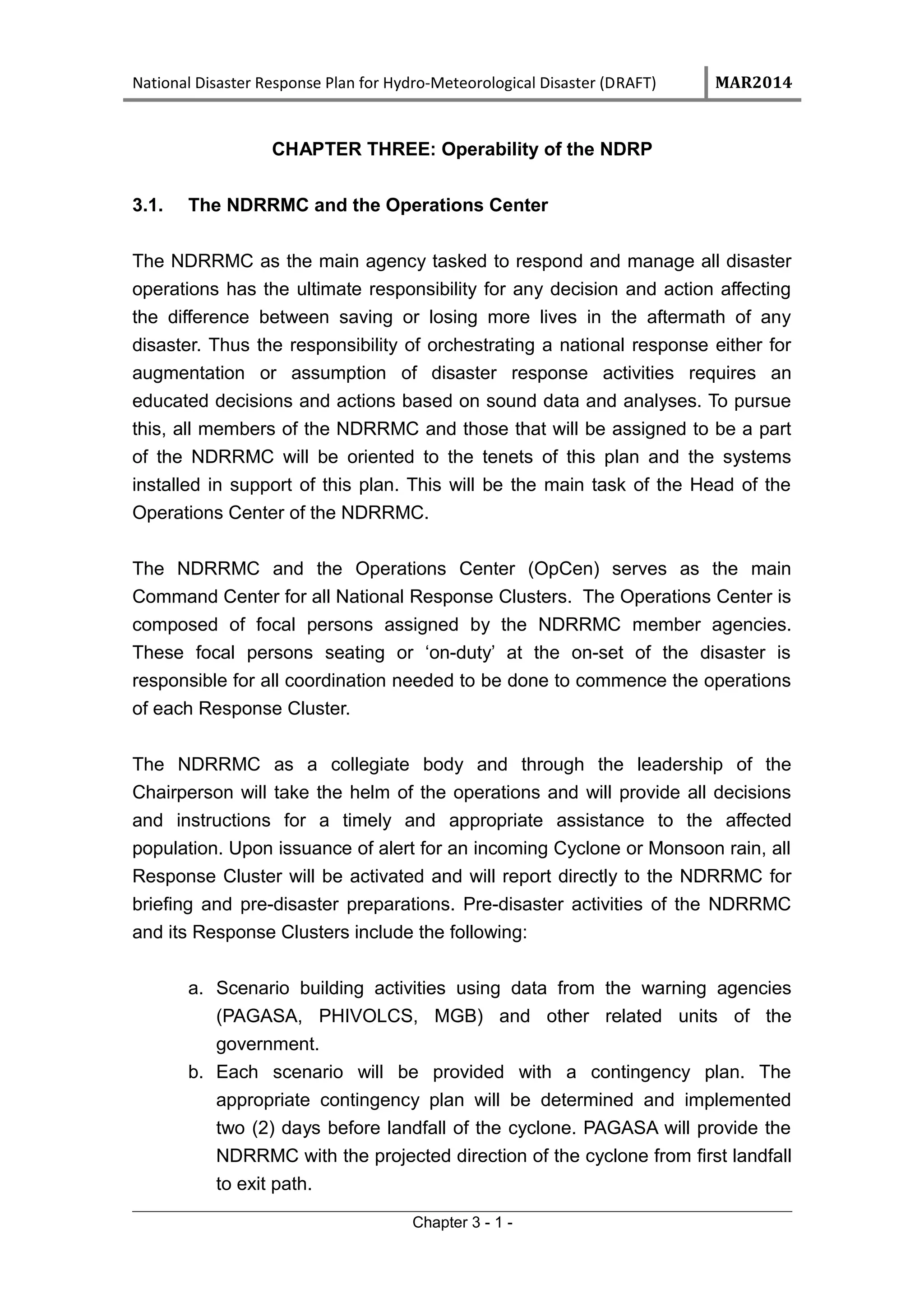 The document outlines the operational framework for responding to hydro-meteorological disasters in the Philippines. It describes the roles and responsibilities of the National Disaster Risk Reduction and Management Council (NDRRMC) and its Operations Center in coordinating the response. The NDRRMC activates 8 response clusters based on reports from affected local governments requesting assistance or if no reports are received. It also coordinates with international organizations and follows protocols to ensure seamless response operations between national, local, and international actors.