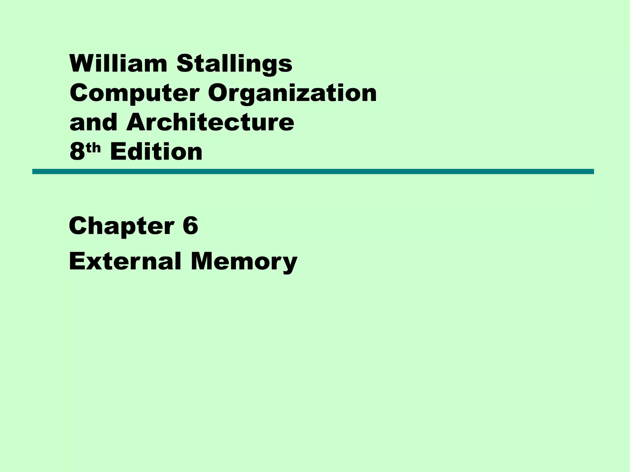 This chapter discusses types of external memory including magnetic disks, optical disks, and magnetic tape. It provides details on disk formatting and organization, read/write mechanisms, disk speed characteristics, and RAID configurations for magnetic disks. Optical disks discussed include CD-ROM, CD-R, DVD, and high definition optical disks. Characteristics of magnetic tape such as Linear Tape-Open (LTO) tape drives are also summarized.