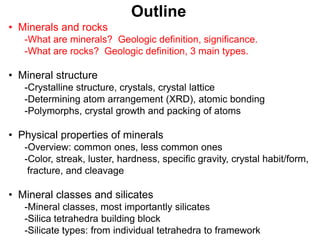 The document discusses minerals and rocks. It defines minerals as naturally occurring solids with a crystalline structure and specific chemical composition, while rocks are aggregates of minerals. There are over 4000 known minerals that are divided into classes based on their dominant chemical component, most importantly the silicates. Silicates are made of silica tetrahedra that bond together in different ways to form distinct mineral groups with varying properties. The document outlines several important physical properties used to identify minerals such as color, crystal structure, hardness, and cleavage.