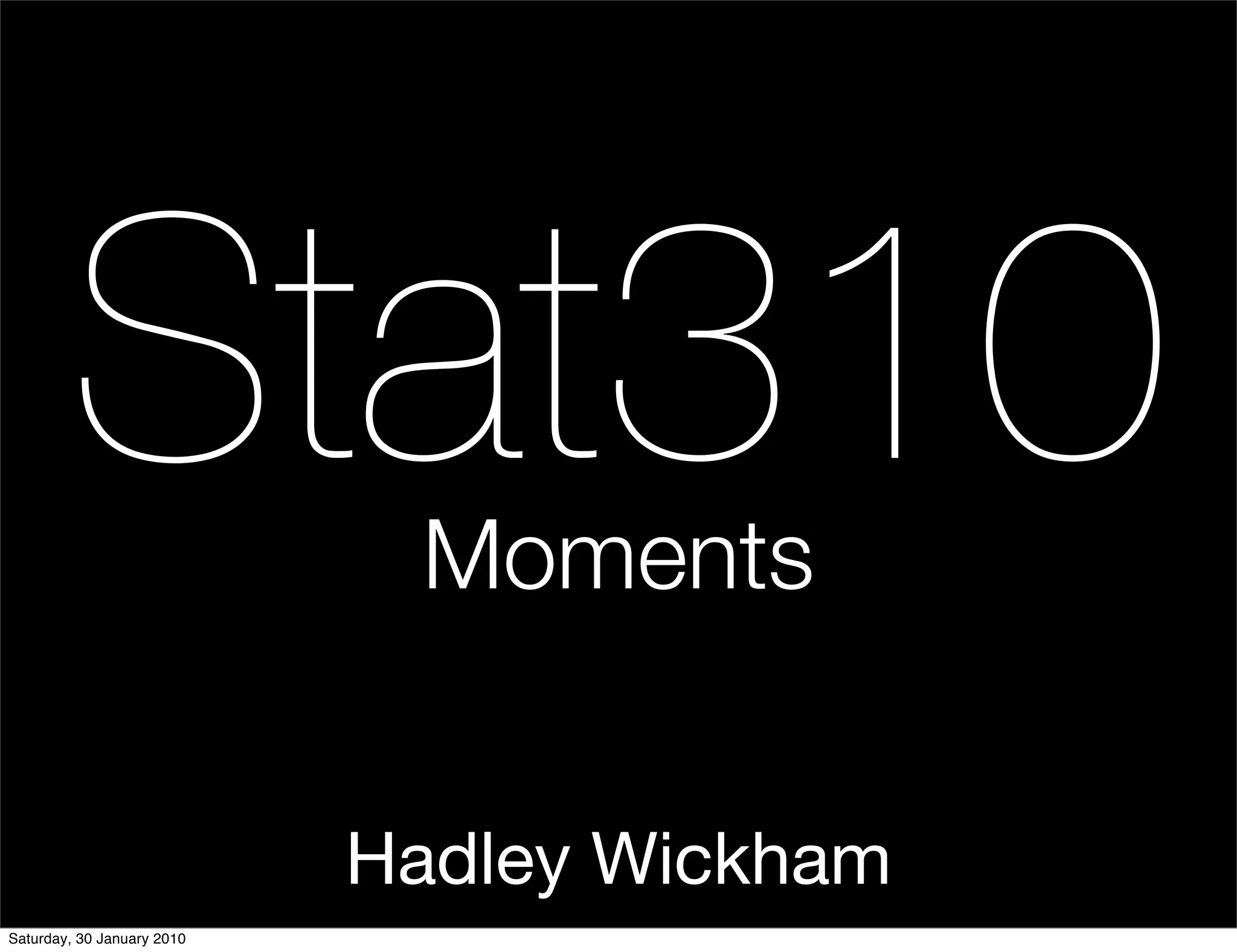This document contains notes from a Stat310 class on moments. It discusses the definition of moments, including that the mean is the first moment and variance is the second central moment. It provides formulas for the mean, variance, skewness, and kurtosis. Examples of different distributions are shown graphically and their properties discussed, including the binomial and Poisson distributions. The moment generating function is introduced and how it can be used to find the mean and variance. Students are asked to practice computing these properties for different distributions.