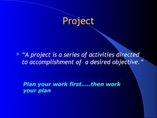 The document discusses project management techniques CPM (Critical Path Method) and PERT (Project Evaluation and Review Technique). It provides a brief history of how CPM was developed by DuPont and PERT was developed by the US Navy. It explains key differences between CPM which uses deterministic activity times and single estimates, and PERT which uses probabilistic activity times and multiple estimates to account for uncertainty. The document also discusses the benefits of using network diagrams to visually represent projects, identify critical paths, calculate slack times, and answer questions about project schedules and budgets.