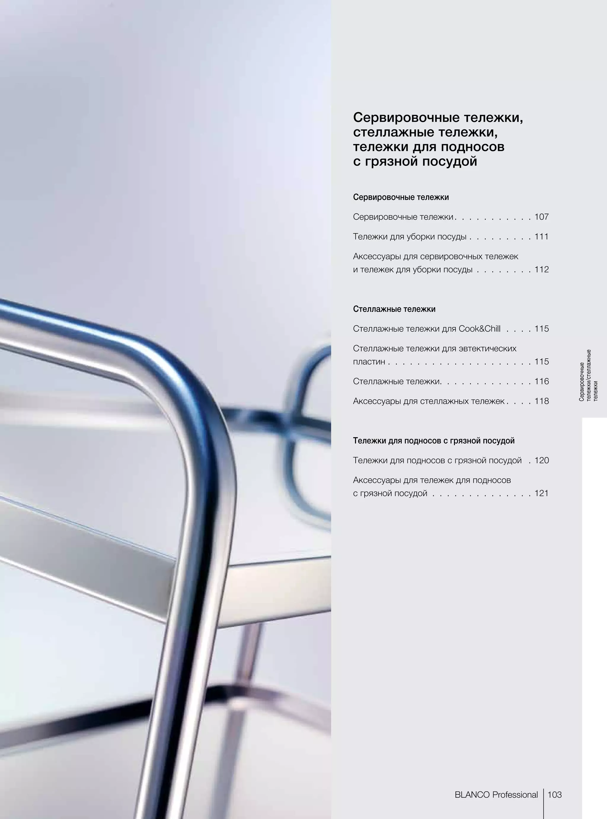 Документ описывает линейку сервировочных и стеллажных тележек, предлагаемых компанией Blanco Professional, включая модели с разным количеством полок и максимальной нагрузкой на полку. Все тележки изготовлены из высококачественной нержавеющей стали с инновационными решениями для повышения стабильности и безопасности. В документе также указаны размеры, грузоподъемность и доступные модели с описанием их основных характеристик.
