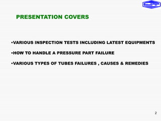 This presentation covers various inspection tests for pressure parts, including visual inspection, thickness measurement, non-destructive testing, and modern equipment. It discusses test classifications like destructive and non-destructive, as well as specific tests like dye penetrant, magnetic particle, ultrasonic, and radiography. The presentation also covers topics like failure analysis, corrosion measurement, and how to properly handle pressure part failures.