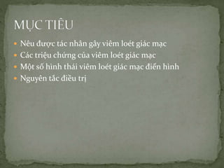 Tài liệu cung cấp thông tin về viêm loét giác mạc, bao gồm tác nhân gây bệnh, triệu chứng và hình thái điển hình. Nó cũng trình bày nguyên tắc điều trị liên quan đến vi khuẩn, nấm và virus, cũng như biện pháp phòng ngừa. Cuối cùng, tài liệu nhấn mạnh tầm quan trọng của việc khám mắt định kỳ và vệ sinh kính tiếp xúc.